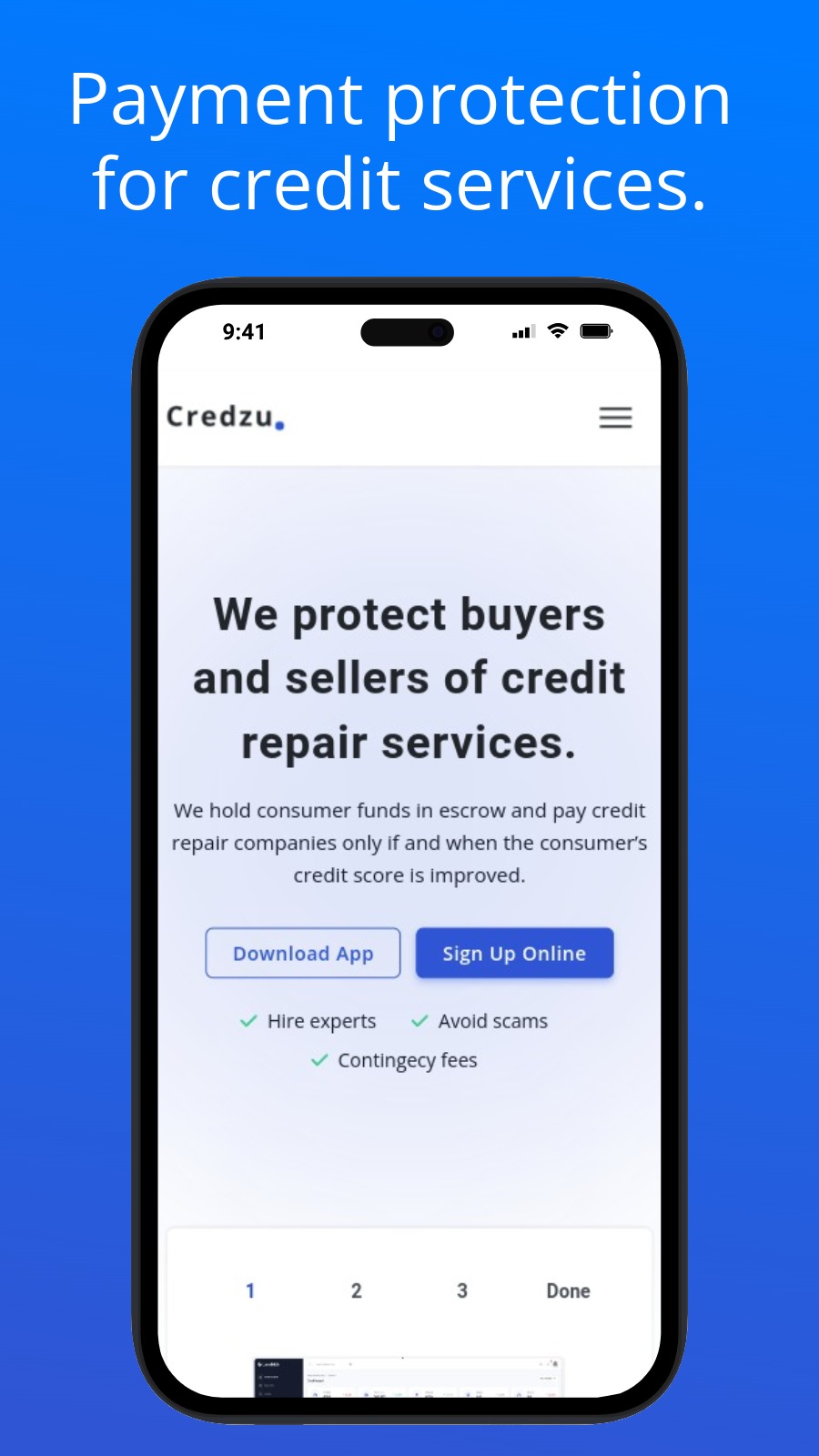 This is the app for the Credzu.com site. Through the app, consumers can higher companies and place funds in an escrow account. We release the money to the companies only if and when they perform as agreed. Otherwise, the money goes back to the consumer. This makes it safe for everyone involved.