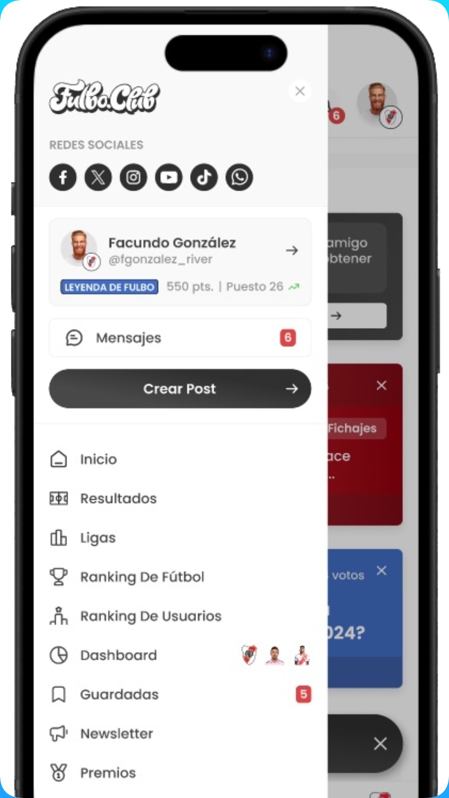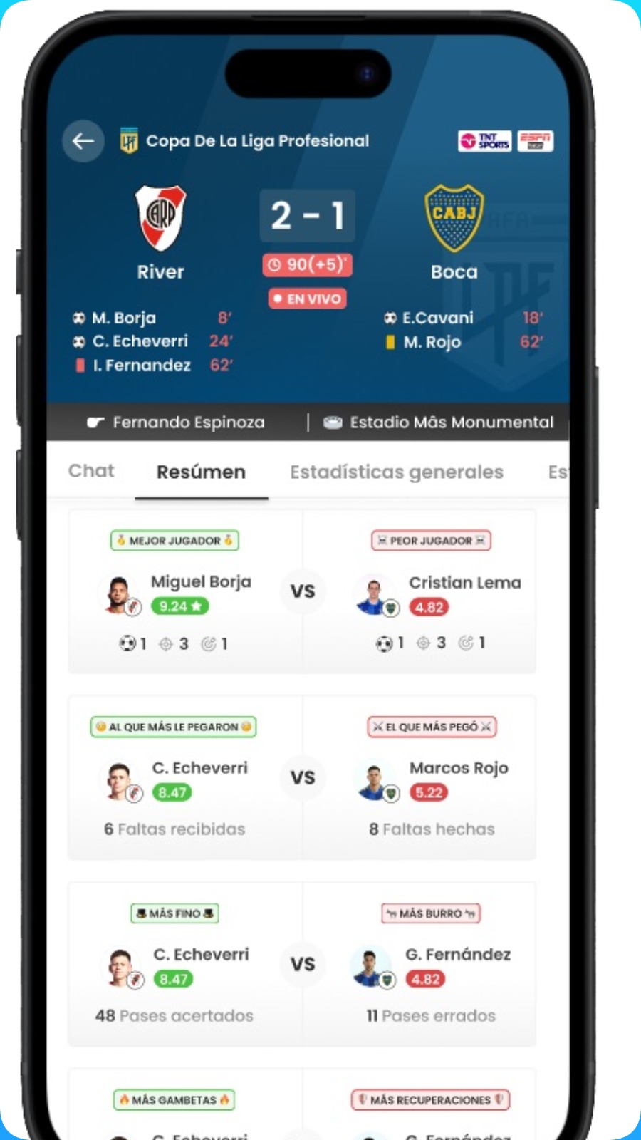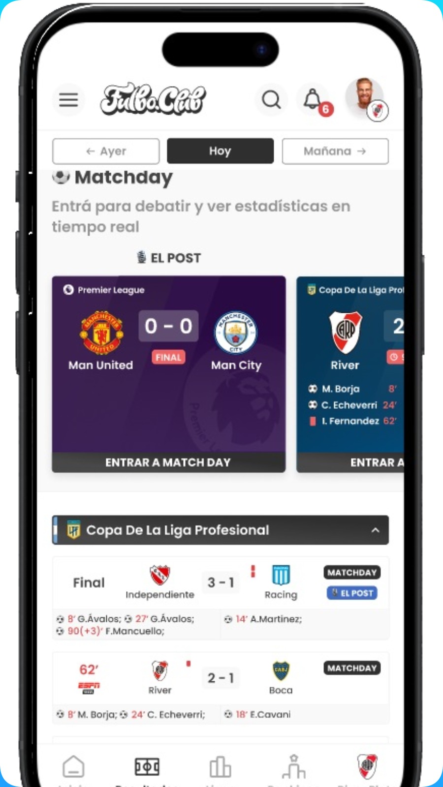 En Fulbo.Club podés seguir en VIVO todos los resultados de los partidos en tiempo real, interactuar con otros hinchas en la Red Social y participar de los juegos y premios.